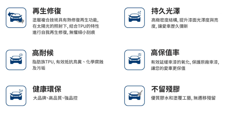 全面守護:9.5mil厚度·全面預防意外刮痕細密雙疏奈米塗層,全面預防酸雨腐蝕,蟲屍鳥糞及駕駛污漬