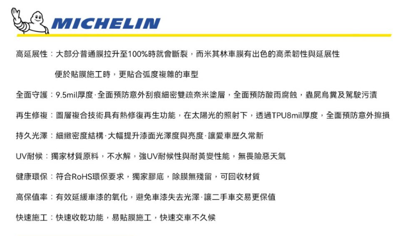 高延展性:大部分普通膜拉升至100%時就會斷裂,而米其林車膜有出色的高柔韌性與延展性