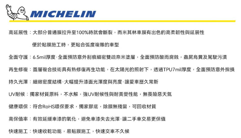 高延展性:大部分普通膜拉升至100%時就會斷裂,而米其林車膜有出色的高柔韌性與延展性