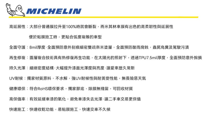 高延展性:大部分普通膜拉升至100%時就會斷裂,而米其林車膜有出色的高柔韌性與延展性