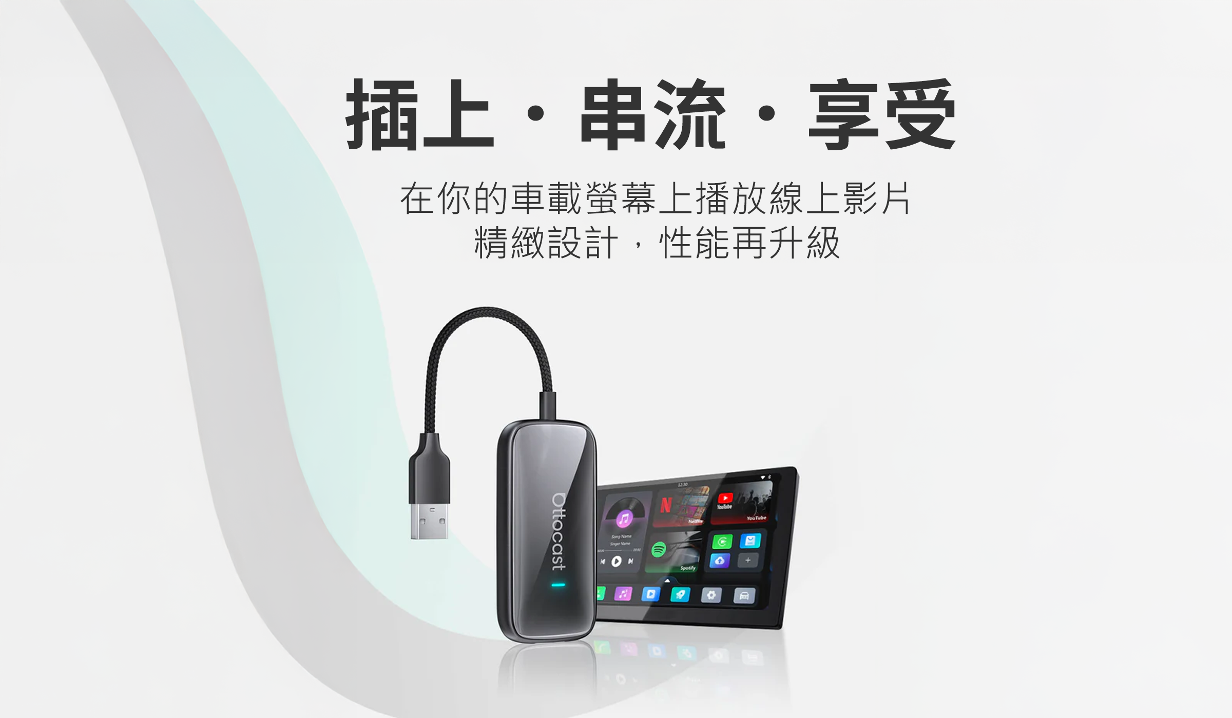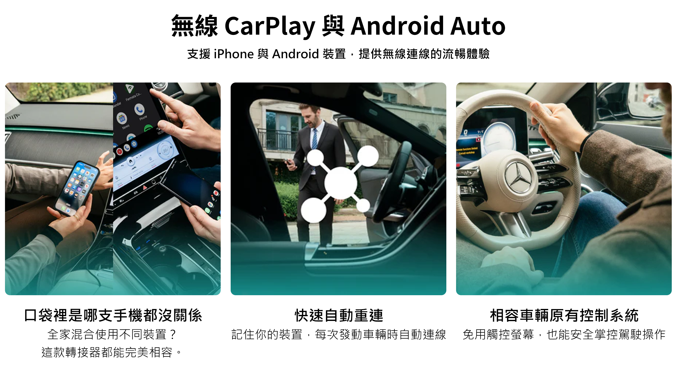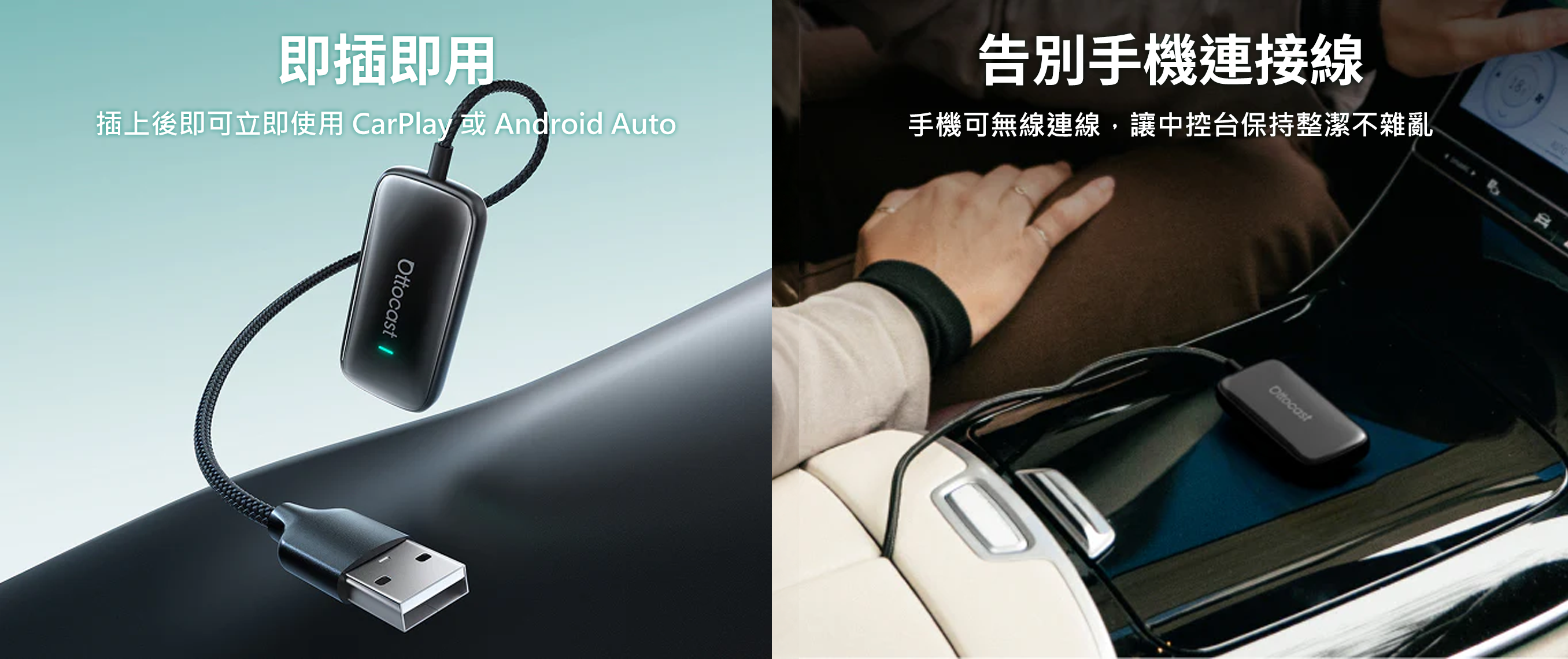 - 瞬間無線化 — 將有線 CarPlay / Android Auto 只需數秒,即可變成無線連線。(需原車支援有線 CarPlay 功能)